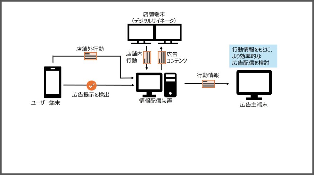 店舗内の行動は、例えば、デジタルサイネージを見る、商品棚の前で立ち止まる、など。こちらはユーザーのスマホデータに加え、店舗に設置されるカメラ等からも取得できます。